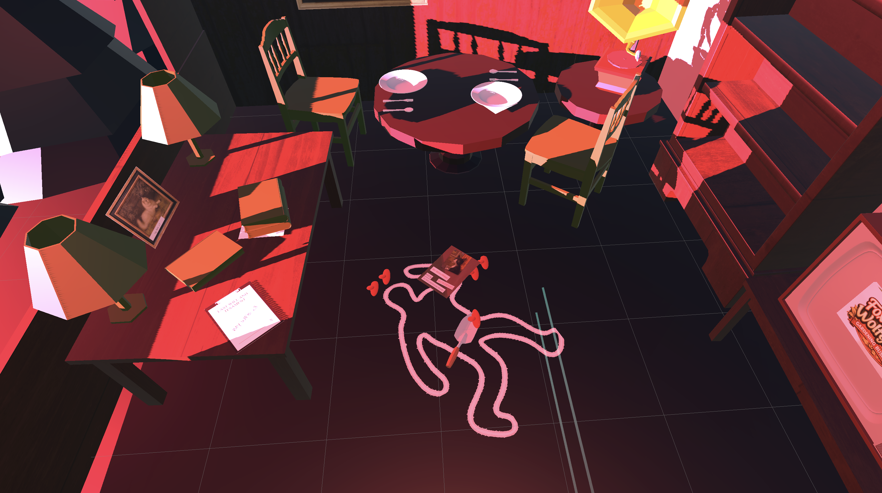 I do wish I had delved deeper into more technical and intricate interactions, allowing for more puzzles or games than just straight deduction. I had a lot of trouble developing a padlock system for a puzzle I was planning on implementing. There's still remnants of what that puzzle was left up on the walls.